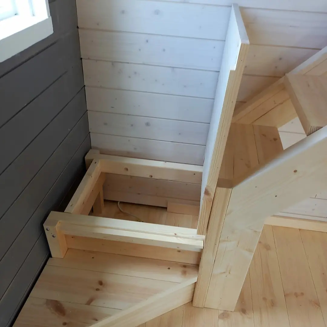 Purimme siirtolapuutarhamökin vanhat väliseinän taakse sijoitetut rappuset kokonaan ja rakensimme tilalle uudet avonaiset kulmarappuset piilolokerolla. Tila laajeni ja valon määrä kasvoi huomattavasti.